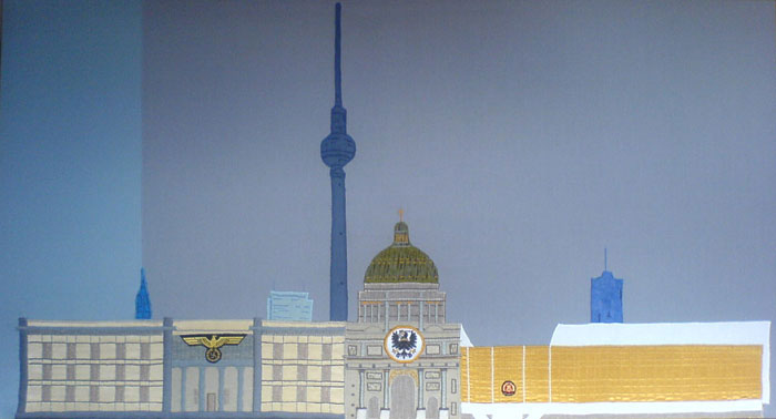 (1938-1953 Abriß durch die Sowjetische Stadtverwaltung) Alle drei Gebäude wurden mit dem Ziel abgerissen, keine baulichen Artefakte einer als negativ empfundenen Zeitgeschichte zu hinterlassen. Die Hoffnung, Geschichte im nachhinein zu bereinigen, hat sich allerdings nicht erfüllt, denn gerade durch die Zerstörung wurden alle drei Gebäude mythisch verklärt. Der "Reichsstadtpalast" mahnt die Nachwelt, Sachzeugen nicht zu zerstören, denn nur sie stellen Zeitgeschichte objektiv dar. The "Reichsstadtpalast" combines in one motive the three main ideological state-buildings, which were tore down in Berlin, the former capital of Prussia, the German Empire and the German Democratic Republic: New