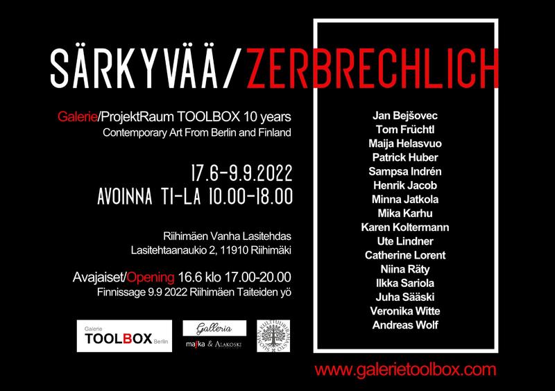 2, Riihimäki, Finnland Die Ausstellung findet in der alten Glasfabrik Riihimäen lasitehdas statt. Es werden finnische und deutsche Künstler aus Berlin präsentiert: Andreas Wolf, Juha Sääski, Ilkka Sariola, Niina Räty, Mika Karhu, Minna Jatkola, Sampsa Indrén, Maija Helasvuo, Henrik Jacob, Karen Koltermann, Patrick Huber, Ute Lindner, Veronika Witte, Jan Bejovec, Catherine Lorent, Tom Früchtl TOOLBOX 10th anniversary exhibition Särkyvää/Zerbrechlich 16.06. bis 09.09.2022 Lasitehtaanaukio 2, Riihimäki, Finland The exhibition will be held at Riihimäen lasitehdas, the old glass factory in Riihimäki. Visitors