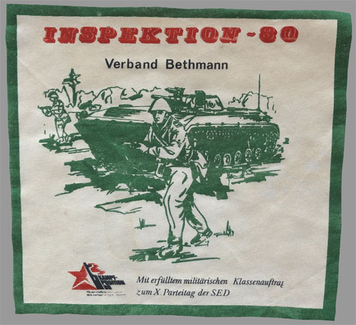 "Inspektion-80 / Verband Bethmann / Mit erfülltem militärischen Klassenauftrag zum X. Parteitag der SED" Kunstseide, 26 x 28 cm, 1980