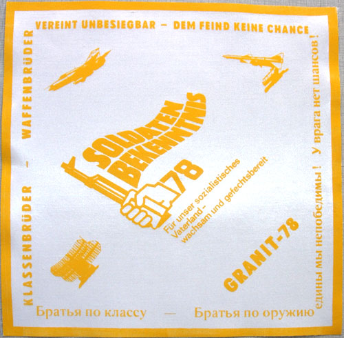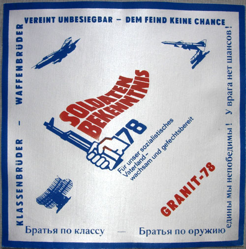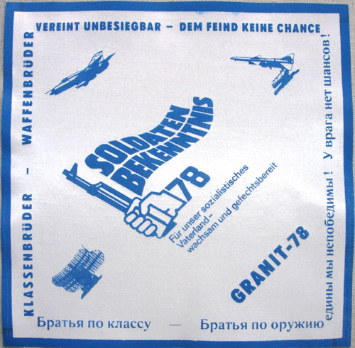 "Soldatenbekenntnis 78 / Für unser sozialistisches Vaterland - wachsam und gefechtsbereit / GRANIT-78 / Klassenbrüder - Waffenbrüder vereint unbesiegbar - dem Feind keine Chance", Kunstseide, 30 x 30 cm, 1978, Nachlass Oberstleutnant der LSK/LV Morave, Druckversion Blau