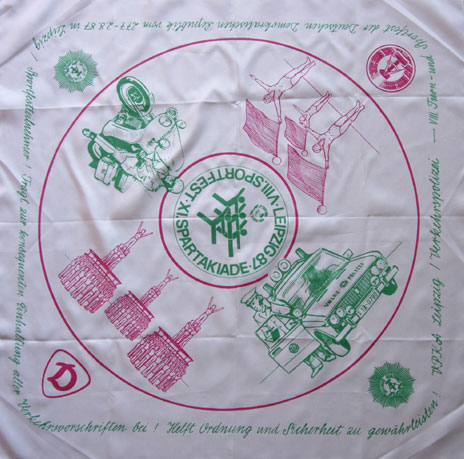"VIII. Sportfest XI. Spartakiade Leipzig 87 / VIII. Turn- und Sportfest der Deutschen Demokratischen Republik vom 27.7.-2.8.87 in Leipzig / Sportfestteilnehmer! Tragt zur konsequenten Einhaltung aller Verkehrsvorschriften bei! / Helft Ordnung und Sicherheit zu gewährleisten! / VPKA Leipzig/Verkehrspolizei", Kunstseide, 67 x 68 cm, 1987 |